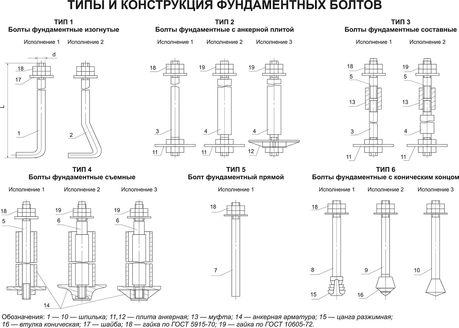 Болт фундаментный (или болт анкерный, анкер) – крепеж, представляющий собой стержень круглого сечения с резьбой на одном конце и специального приспособления на другом, которое позволяет установить болт внутри фундамента (ГОСТ 24379.1-80). Исходя из особенностей исполнения данных болтов, выделяют 6 типов фундаментных болтов (см. чертеж).