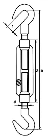 Талреп крюк-крюк DIN 1480 открытый. Варианты с разными концевиками: крюк - кольцо (петля), кольцо - кольцо (петля - петля), крюк - крюк. Талреп используется при монтажных, строительных и других работах для изменения длины и регулировки натяжения стальных тросов, канатов, цепей, но не для подъёма грузов.
